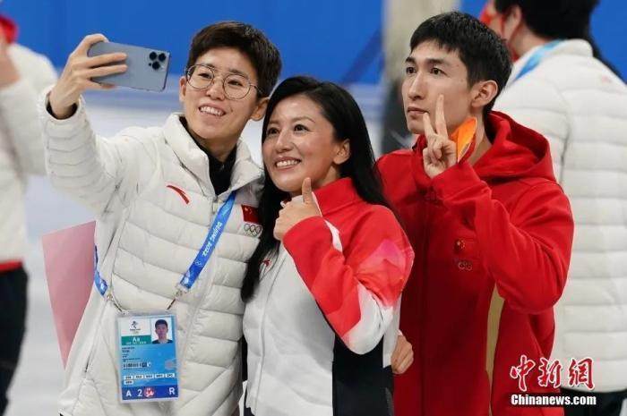 赛后中国短道速滑队集体在首都体育馆冰面合影。图为范可新、杨扬、武大靖合影。中新社记者 崔楠 摄