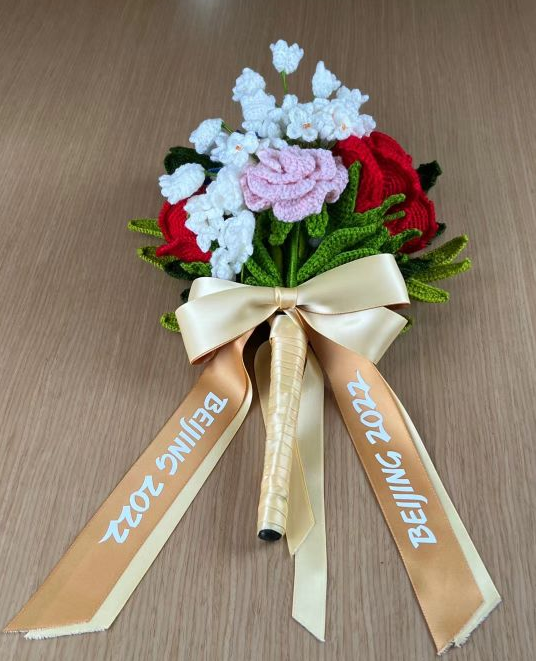 质检的标准,不仅要每个花片编织达标、花枝美观、花束漂亮,最重要的是安全。“整个花束的骨架是金属,小花片里缠绕着0.4毫米粗的铜丝、花枝和花柄里是2毫米粗的铁丝。”刘晓云说。残奥会上,运动员们身体情况各有不同,领奖时不是所有人都能手捧花束,失去双手的运动员则会用头部和肩颈来夹住花束。“这就要求绒线必须将所有金属包裹起来,不能有一毫米金属伸出扎伤运动员。”