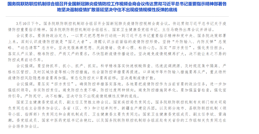 国家卫生健康委员会网站消息,3月10日下午,国务院联防联控机制综合组召开全国新冠肺炎疫情防控视频会商会议,传达贯彻习近平总书记关于疫情防控重要指示精神。国务院联防联控机制综合组组长、国家卫生健康委党组书记、主任马晓伟出席会议并讲话。