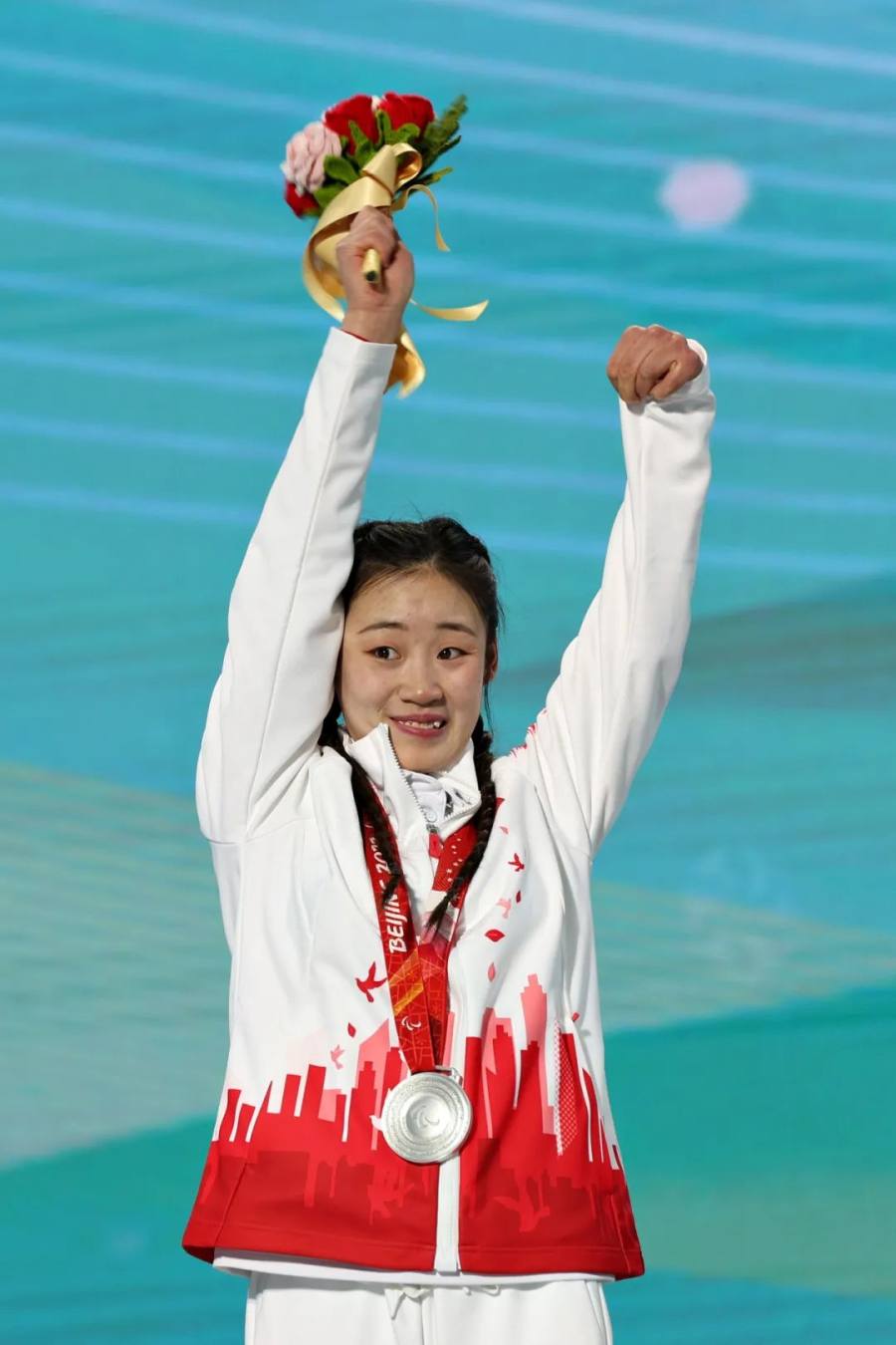 △3月8日,北京2022年冬残奥会高山滑雪女子全能站姿赛颁奖仪式,张梦秋获得银牌。