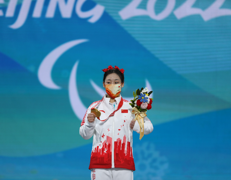 △3月6日,北京2022年冬残奥会高山滑雪女子超级大回转站姿赛颁奖仪式,张梦秋获得金牌。
