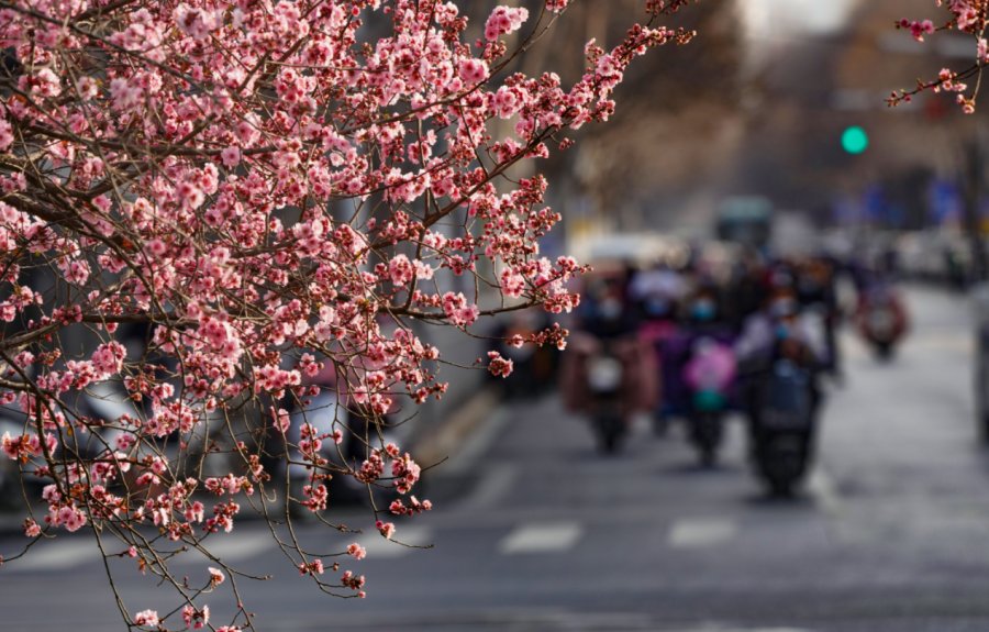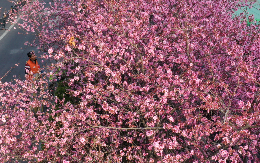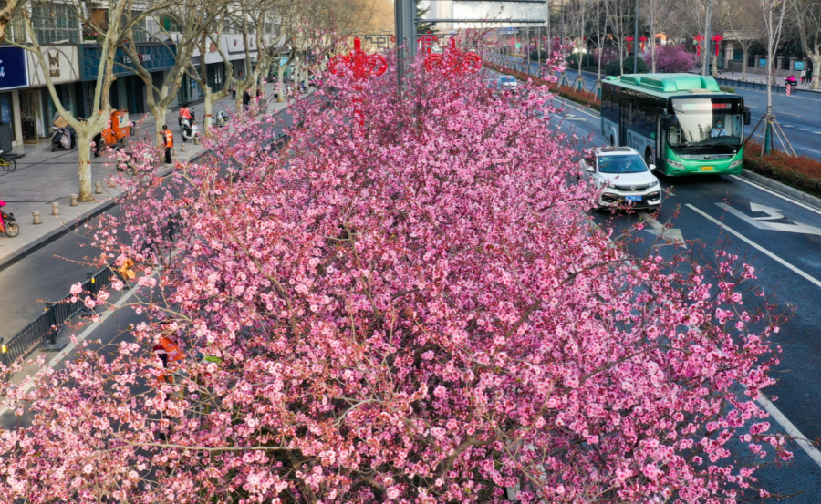3月11日,工人路到西三环之间的建设路绿化带内,粉红色的美人梅集中盛开,把整个街道染成了浪漫的粉红色。