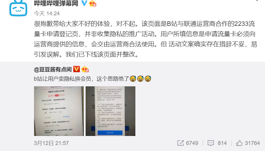 针对日前有网友发文质疑B站让用户卖隐私换会员一事,B站通过其官方微博回应称,很抱歉带给大家不好的体验,对不起。该页面是B站与联通运营商合作的2233流量卡申请登记页,并非收集隐私的推广活动。用户所填信息是申请流量卡必须向运营商提供的信息,会交由运营商合法使用。但活动文案确实存在措辞不妥,易引发误解。我们已下线该页面并整改。