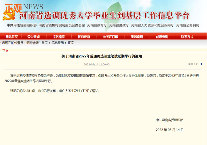 3月14日,等待了两天的好消息终于传来!记者在“河南省选调优秀大学毕业生到基层工作信息平台”首页看到考试延期的公告,公告通知:“鉴于近期疫情防控形势复杂严峻,为贯彻落实疫情防控部署要求,保障考生和考务工作人员身体健康,经研究,原定于2022年3月19日进行的2022年普通类选调生笔试延期举行。”