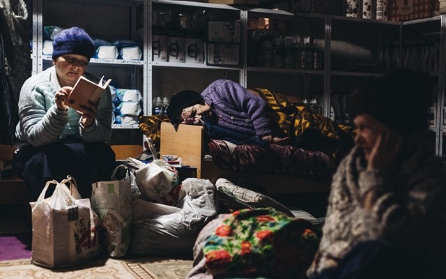 3月11日,人们待在乌克兰基辅一处安置点的地下室内。
