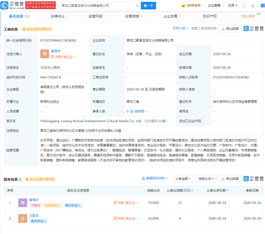 企查查APP显示,黑龙江聚享互娱文化传媒有限公司,该公司成立于2020年9月,注册资本30万元,执行董事兼总经理、法定代表人为黄海宇,值得注意的是,该公司参保人数为0。