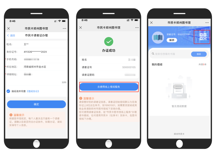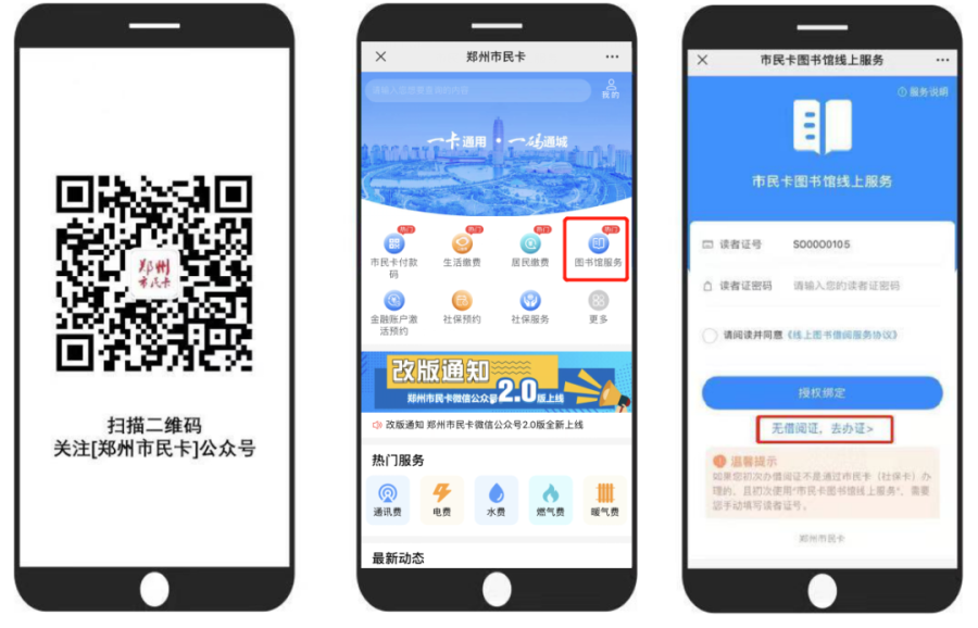 即日起,郑州市民卡(社保卡)持卡人在“郑州市民卡”微信公众号平台可享受线上开卡、老卡绑定、在线续借、读者证展码等服务。