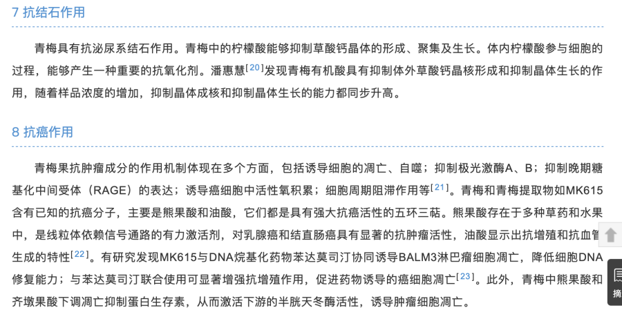 青梅真的有如此作用吗?正观新闻记者查阅相关资料发现,2020年发表于《现代农业科技》的文章《青梅的营养健康效应研究进展》指出,青梅具有抗菌消炎、抗氧化、抗结石、抗癌、代谢调节等作用,但记者发现在青梅抗癌作用的表述中,作者认为“青梅果抗肿瘤成分的作用机制体现在多个方面,包括诱导细胞的凋亡、自噬;抑制极光激酶A、B;抑制晚期糖基化中间受体(RAGE)的表达;诱导癌细胞中活性氧积累;细胞周期阻滞作用等”。