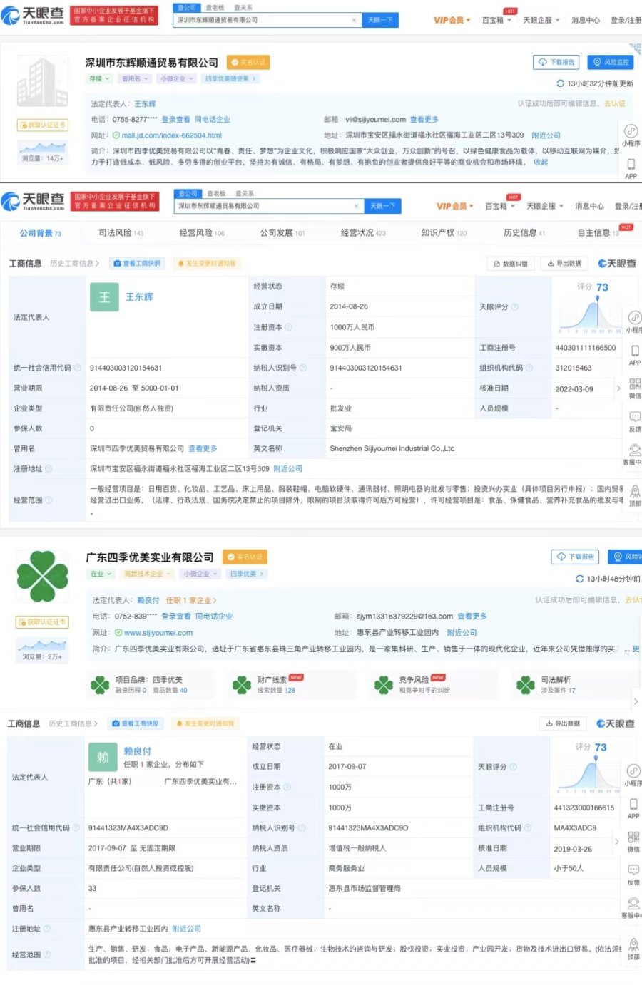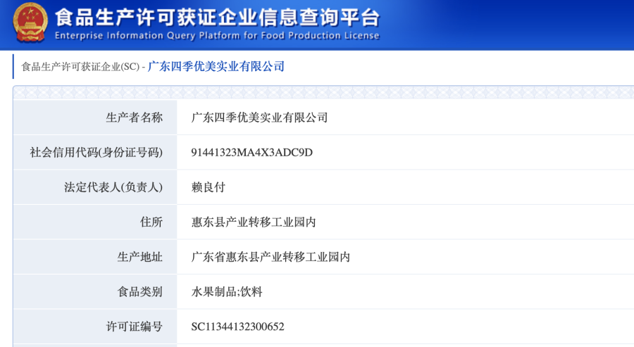 “深圳市四季优美实业有限公司”于2014年8月24日成立,地址为深圳市宝安区福永街道福永社区福海工业区二区13号309,法定代表人王东辉,100%持股,现已更名为“深圳市东辉顺通贸易有限公司”,但其简介仍以“深圳市四季优美贸易有限公司”进行介绍,项目品牌显示四季优美随便果。