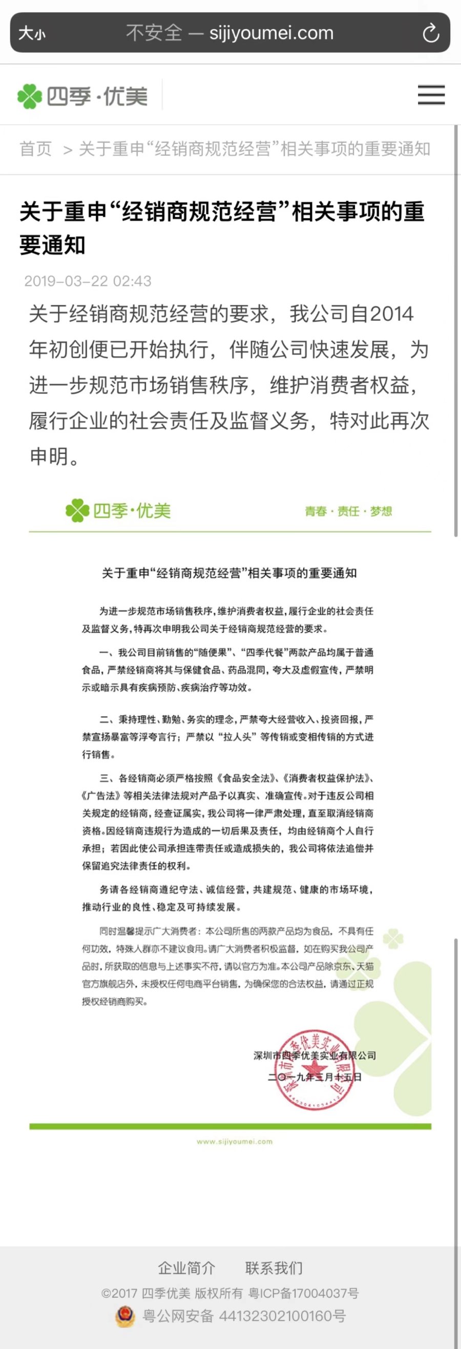 但结尾落款为“深圳市四季优美贸易有限公司”,而非账号主体公司“广东四季优美实业有限公司”,该文章在“广东四季优美实业有限公司”官网也被发布,落款同样为“深圳市四季优美贸易有限公司”,并声称“我公司自2014年初创便已开始执行”。