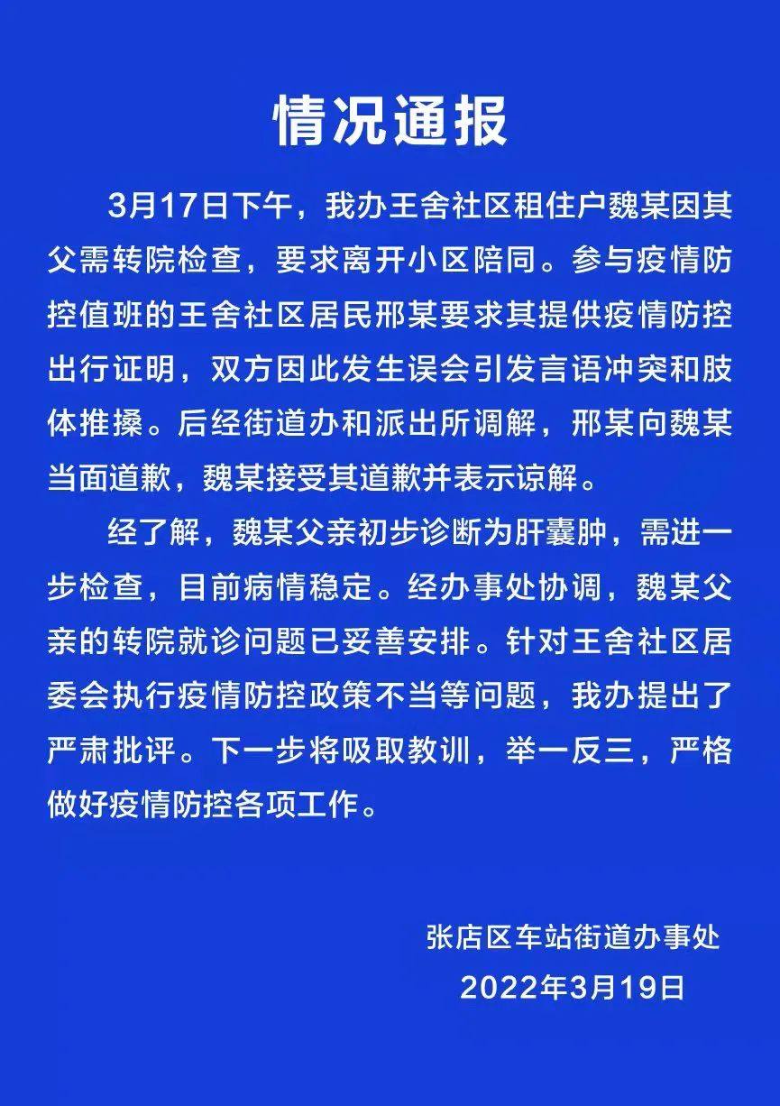 据山东淄博“张店区车站办事处”微信公众号19日通报:3月17日下午,张店区车站街道办王舍社区租住户魏某因其父需转院检查,要求离开小区陪同。参与疫情防控值班的王舍社区居民邢某要求其提供疫情防控出行证明,双方因此发生误会引发言语冲突和肢体推搡。后经街道办和派出所调解,邢某向魏某当面道歉,魏某接受其道歉并表示谅解。