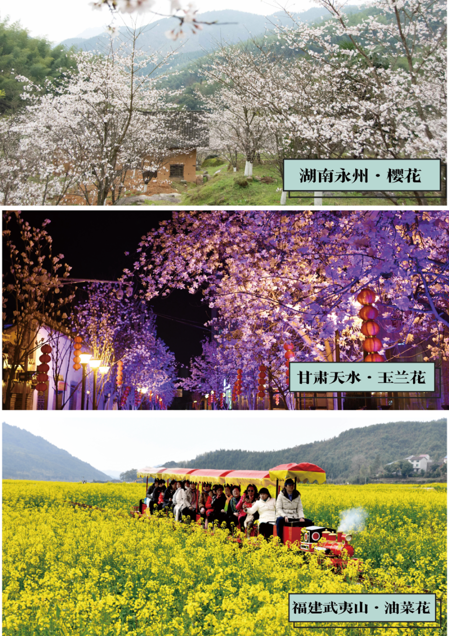 在湖南永州,湘江大峡谷里满树的樱花被春风唤醒,粉白色的花朵缀满枝头;在甘肃天水,玉兰花捧出白净的花苞,清香阵阵;在福建武夷山,油菜花盛放,翠绿搭配金黄,轻快明亮。