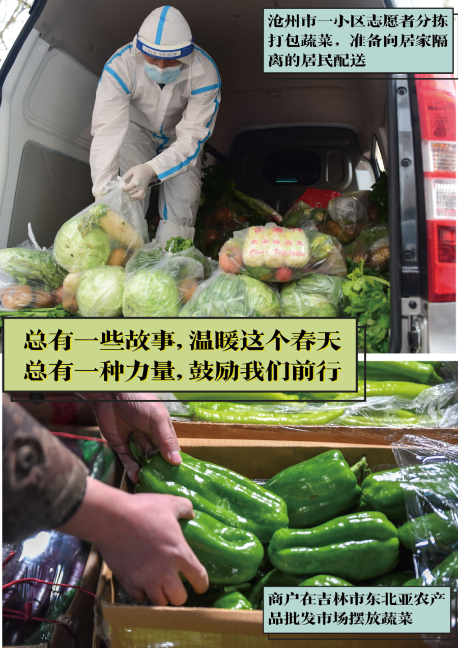 疫情当前,沈阳铁路紧急运输1.9吨蔬菜驰援吉林;多地为封控居民提供“蔬菜生鲜包”,志愿者们在风雪中接续奋战,将新鲜的蔬菜送到每一户居民手中;各地畅通生活物资运输渠道,全力保障“菜篮子”供应。