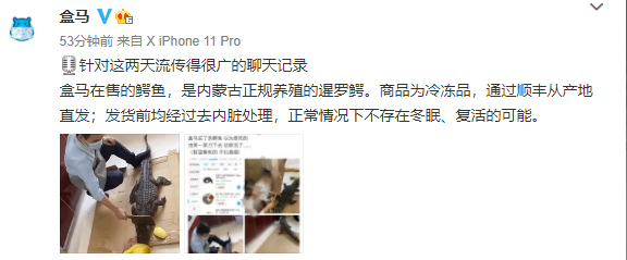 盒马回应售卖活鳄鱼:经过解剖,不存在冬眠复活的可能