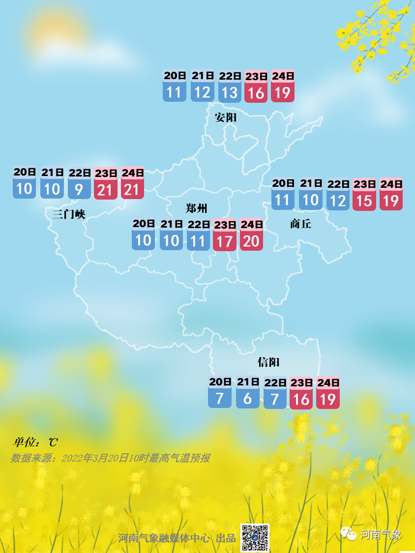 今天下午到夜里,南阳、信阳、驻马店三地区和平顶山、漯河、周口三地区南部阴天有小雨,其中信阳地区和驻马店、南阳两地区南部部分县市有中到大雨,局部暴雨,高海拔山区有雨夹雪;其它地区阴天转多云。南部东北风4级左右,局地阵风6到7级。
