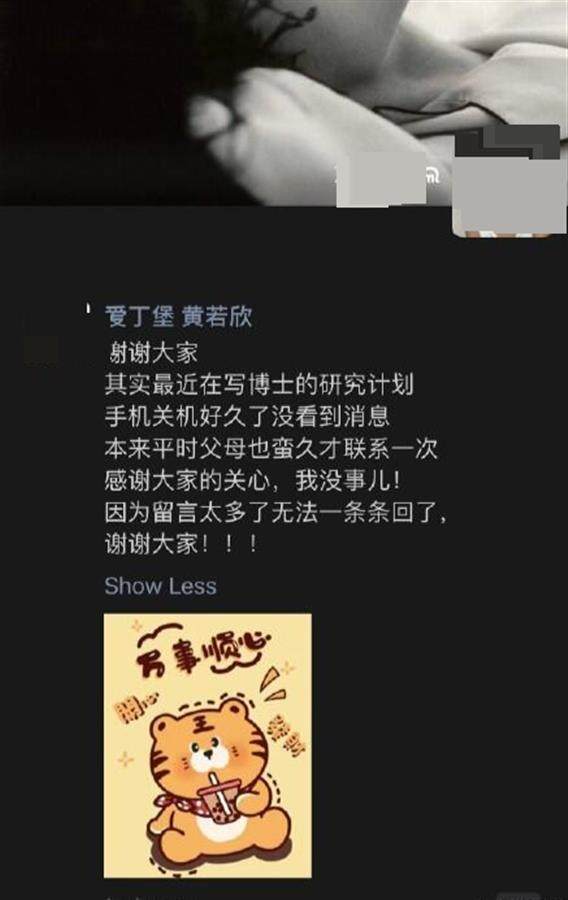 记者注意到,20日晚,有一条疑似黄若欣本人的微信朋友圈称,她最近在写博士的研究计划,因此关了机,而平时她与父母也是蛮久才联系一次。