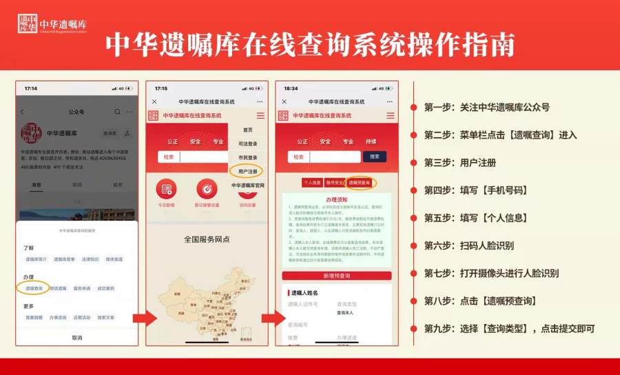 遗嘱人去世后,其家人如果不知道该遗嘱的存在,或者司法机关没有找到该遗嘱,可能导致遗产分割出现违背遗嘱人意愿的情形。为了避免这种现象,中华遗嘱库从2022年3月21日起,正式向社会推出“遗嘱在线查询”的免费服务。据悉,该线上查询系统将逐步取代过往传统的线下查询服务。在中华遗嘱库办理查看或者提取遗嘱原件手续前,需要完成一项前置程序:“预查询”。“预查询”是指申请人携带本人身份证、被继承人死亡证明,便可向中华遗嘱库申请查看被继承人生前是否有留下遗嘱。如果被继承人生前有留下遗嘱的,则系统会显示出申请人是否有资格查看或者提取遗嘱原件。“遗嘱在线查询”服务可以为遗嘱人本人、继承人、法院、公证处、房管部门等单位提供查询服务。