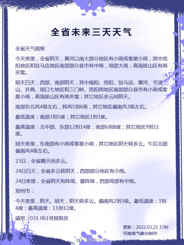 今天白天,西部、南部阴天,其中南阳、信阳、驻马店、漯河、平顶山、许昌、周口七地区和三门峡、洛阳两地区南部部分县市有小雨或零星小雨,高海拔山区有雨夹雪;其它地区多云间阴天。