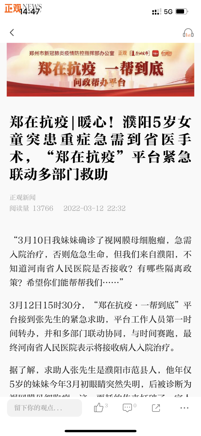 3月12日15时30分,“郑在抗疫·一帮到底”平台接到濮阳市民张先生的紧急求助,称其年仅5岁的妹妹被诊断为视网膜母细胞瘤,所在县医院因治疗条件有限,需要立即前往郑州治疗。因濮阳突发疫情,害怕耽误治疗时间的张先生心急如焚。