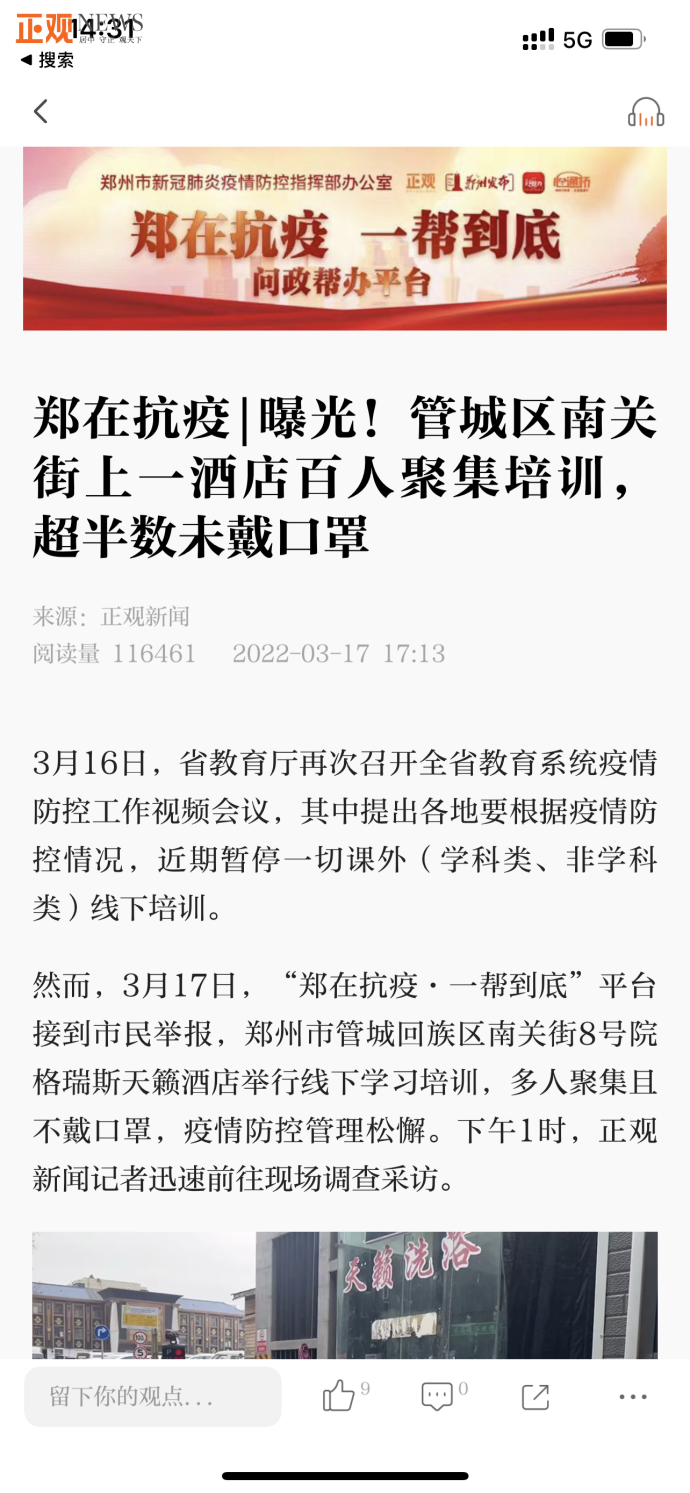 3月17日,群众举报郑州市管城回族区南关街8号院格瑞斯天籁酒店举行线下学习培训,多人聚集且不戴口罩。记者迅速前往现场调查,推出报道《郑在抗疫|曝光!管城区南关街上一酒店百人聚集培训,超半数未戴口罩》。