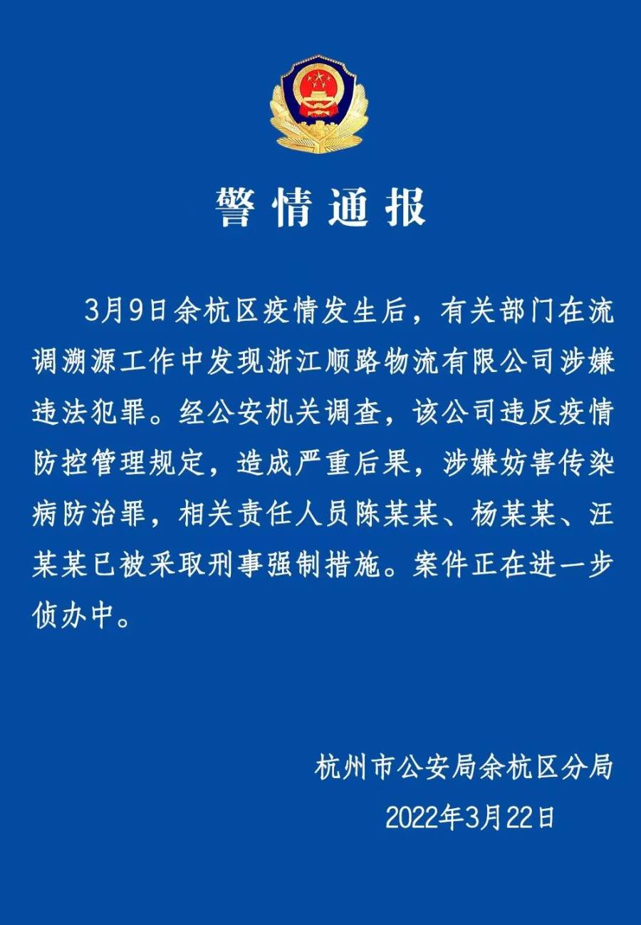 杭州市公安局余杭区分局发布警情通报:3月9日余杭区疫情发生后,有关部门在流调溯源工作中发现浙江顺路物流有限公司涉嫌违法犯罪。经公安机关调查,该公司违反疫情防控管理规定,造成严重后果,涉嫌妨害传染病防治罪,相关责任人员陈某某、杨某某、汪某某已被采取刑事强制措施。案件正在进一步侦办中。