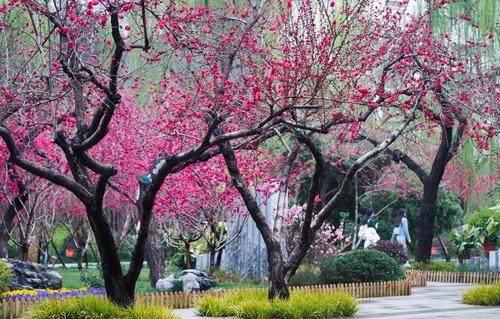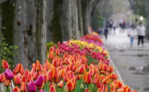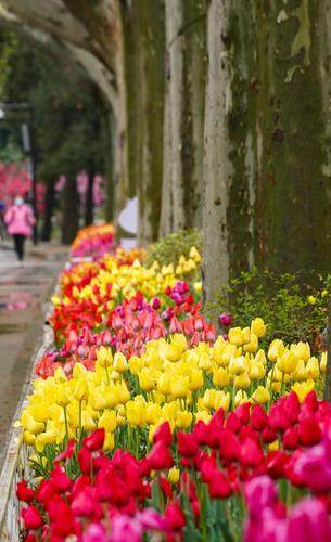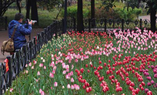2022年3月25日,郑州,雨后的人民公园美景如画,当天郁金香展开幕,同时樱花、桃花、海棠、紫荆等百花齐放,每一个角落都是姹紫嫣红,吸引了众多市民游园赏花。