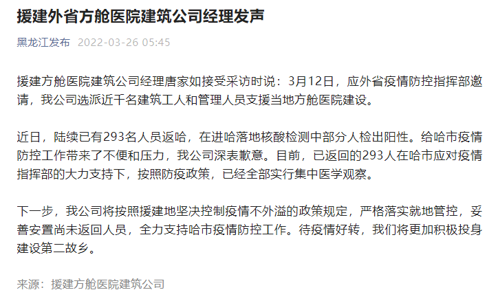 援建方舱医院部分返哈人员检出阳性,建筑公司经理:深表歉意