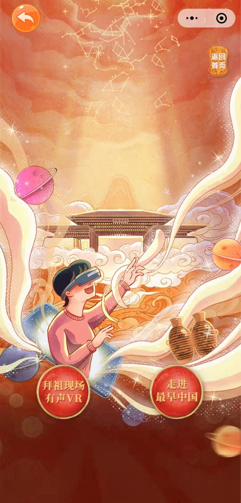 进入“拜祖现场有声VR”和“走进最早中国”模板中,可选择不同景点入口,感受“云游”景区,追寻“文明胚胎”的河洛古国魅力。