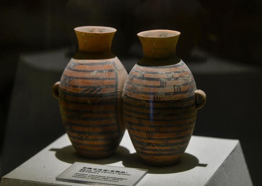 大河村遗址出土的彩陶双连壶(复制品)。
