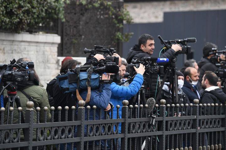 3月29日,媒体记者聚集在土耳其伊斯坦布尔的俄乌代表团谈判会场外。新华社记者 沙达提 摄