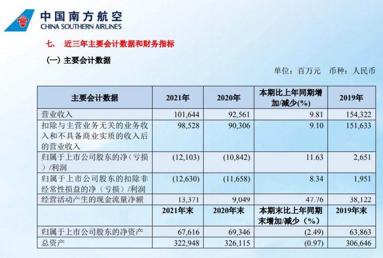2021年南方航空实现营业收入1016.44亿元,同比增9.81%;归属于上市公司股东的净利润亏损121.03亿元,2020年同期亏损108.42亿元。