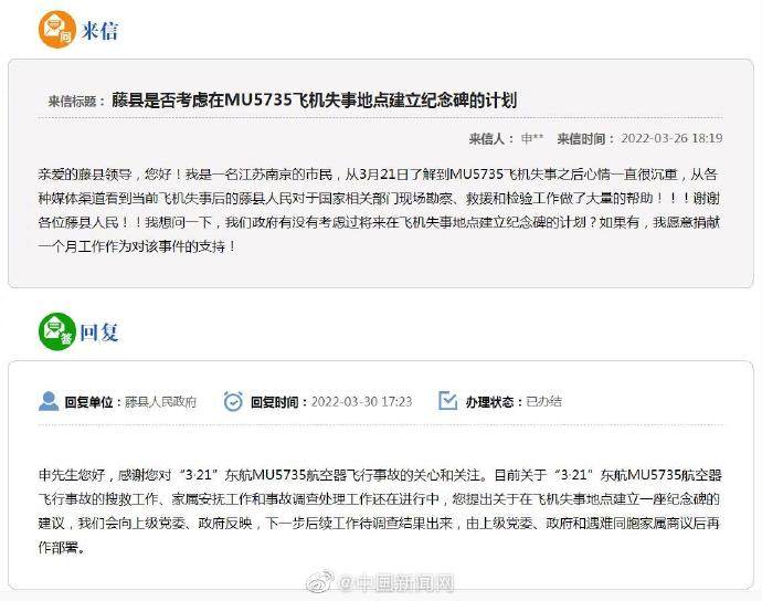 3月26日,有网友在广西藤县政府官网留言询问,是否考虑在MU5735飞机失事地点建立纪念碑。滕县政府30日回复称,目前关于“3·21”东航MU5735航空器飞行事故的搜救工作、家属安抚工作和事故调查处理工作还在进行中,关于建立一座纪念碑的建议会向上级党委、政府反映,下一步后续工作待调查结果出来,由上级党委、政府和遇难同胞家属商议后再作部署。