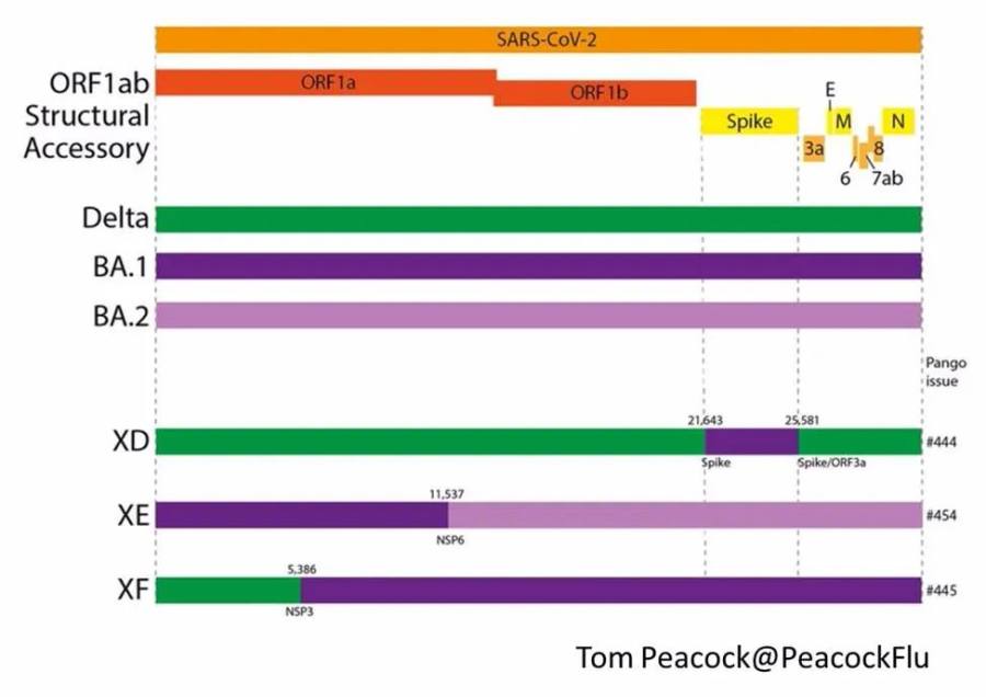 基因组图解:XD、XE、XF三种变体如何进行毒株重组。图源英国卫生安全局