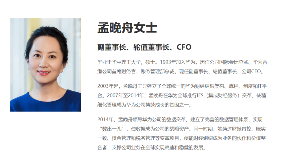 据华为官网显示,孟晚舟毕业于华中理工大学,硕士。1993年加入华为。历任公司国际会计总监、华为香港公司首席财务官、账务管理部总裁。现任副董事长、轮值董事长、公司CFO。