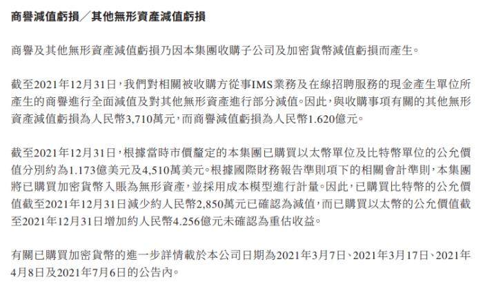 虽然在商誉减值亏损一栏中,美图公司表示,由于此前参与加密货币投资,截至2021年12月31日,根据当时市价厘定的集团已购买以太币单位及比特币单位的公允价值,分别约为1.173亿美元及4510万美元。因此,截至2021年12月31日,已购买比特币的公允价值减少约人民币2850万元,已确认为减值,而已购买以太币的公允价值截至2021年12月31日增加约人民币4.256亿元,未确认为重估收益。