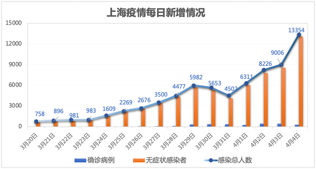 4月4日0时至24时,上海市新增本土确诊病例268例、无症状感染者13086例,感染总数达13354例,首次单日新增破万例。上海市政府副秘书长、市疫情防控工作领导小组办公室主任顾洪辉在4月5日上海市疫情发布会上介绍,上海疫情还在高位运行,形势极其严峻。