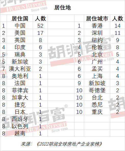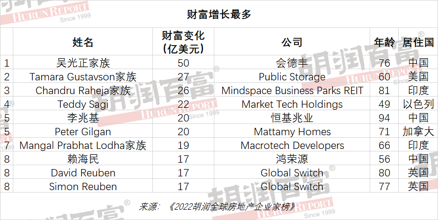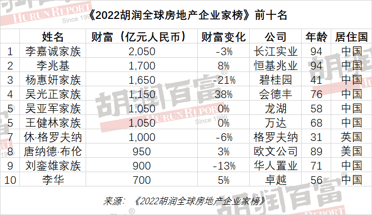 《2022胡润全球房地产企业家榜》前十名