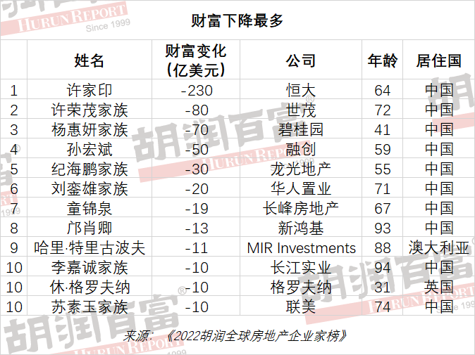2022胡润全球房地产企业家榜李嘉诚居首,许家印财富缩水1500亿、下降最多
