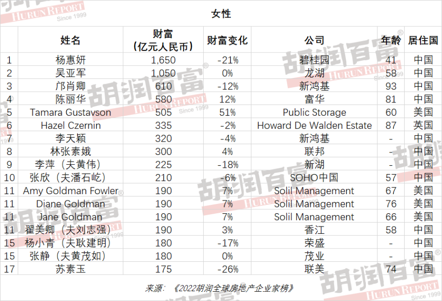 女企业家占比17%,高于胡润全球富豪榜总榜的女性比例(15%),其中12位来自中国,包括前四名,以碧桂园41岁的杨惠妍为首,财富1650亿元;其次是龙湖58岁的吴亚军,财富1050亿元