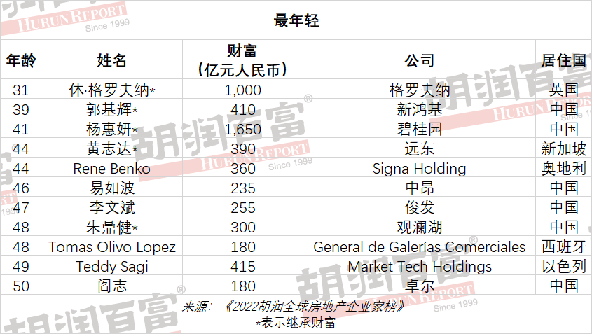 11位年龄不超过50岁,其中6位是白手起家的,5位是继承财富的。最年轻的是来自英国的31岁休·格罗夫纳,他是家族第八代,财富1000亿元;其次是新鸿基39岁的郭基辉,财富410亿元