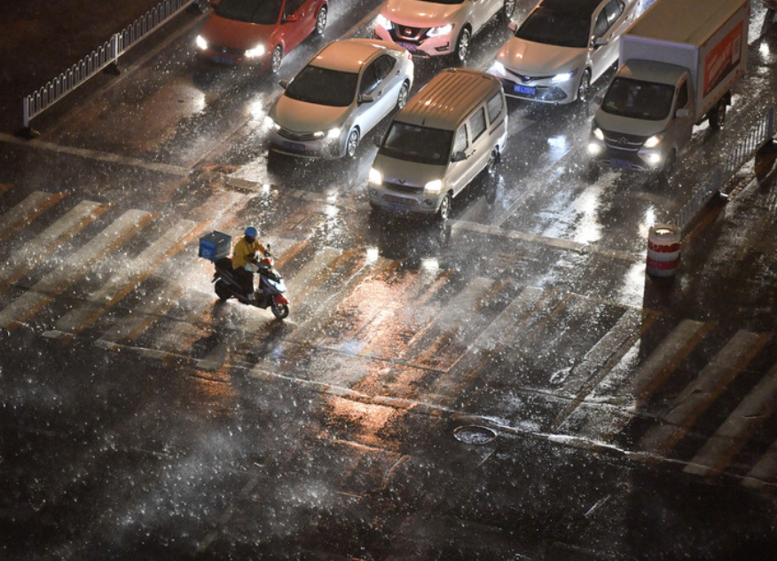 2021年4月15日傍晚,在天津市南开区,外卖骑手在风雨中骑行过马路。新华社发(孙凡越 摄)