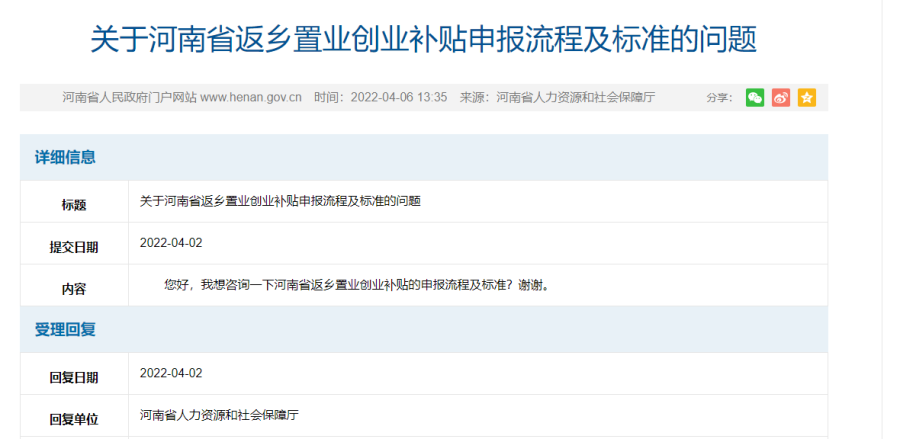 近日,有群众在河南省人民政府互动交流平台咨询“河南省返乡置业创业补贴的申报流程及标准”。