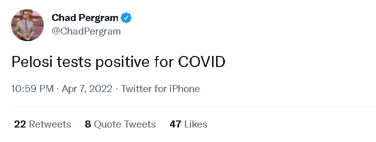 北京时间4月7日晚临近11点时,美国福克斯新闻网的国会新闻跑口记者Chad Pergram在社交媒体上发帖,称美国国会众议院议长、现年82岁的南希·佩洛西新冠检测呈阳性。