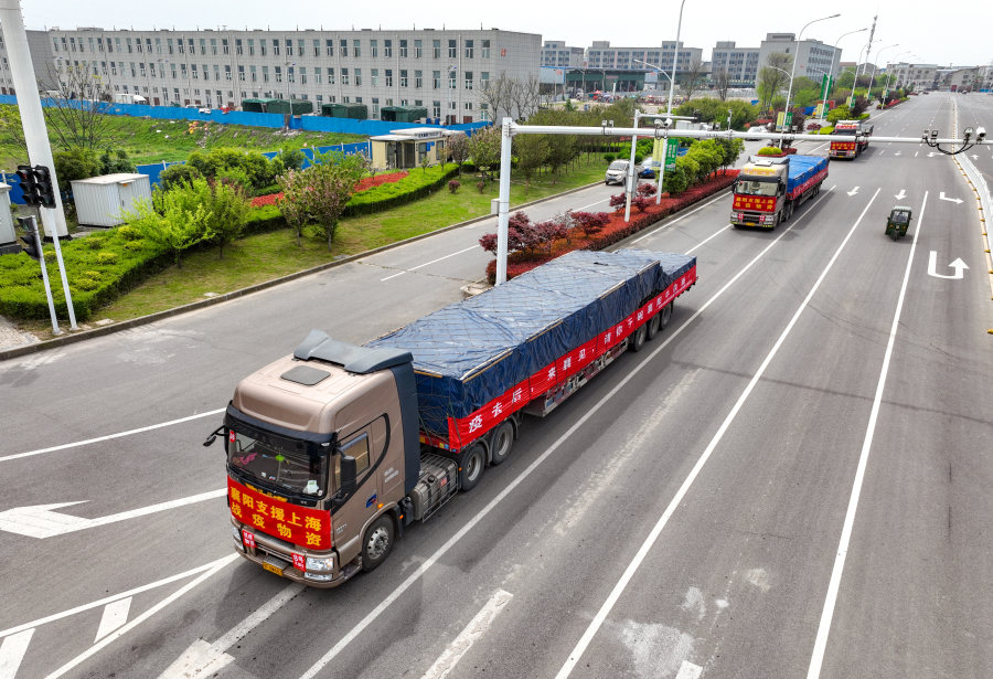 4月9日,装有蔬菜的车队从襄阳出发前往上海 新华社图