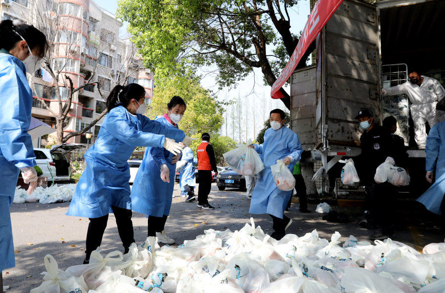4月3日,在上海闵行区七宝镇一个封控居民小区内,社区志愿者摆放清点刚卸下车的生活物资。新华社图