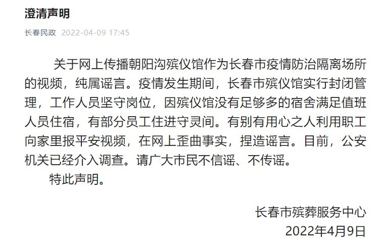 关于网上传播朝阳沟殡仪馆作为长春市疫情防治隔离场所的视频,纯属谣言。疫情发生期间,长春市殡仪馆实行封闭管理,工作人员坚守岗位,因殡仪馆没有足够多的宿舍满足值班人员住宿,有部分员工住进守灵间。有别有用心之人利用职工向家里报平安视频,在网上歪曲事实,捏造谣言。目前,公安机关已经介入调查。请广大市民不信谣、不传谣。