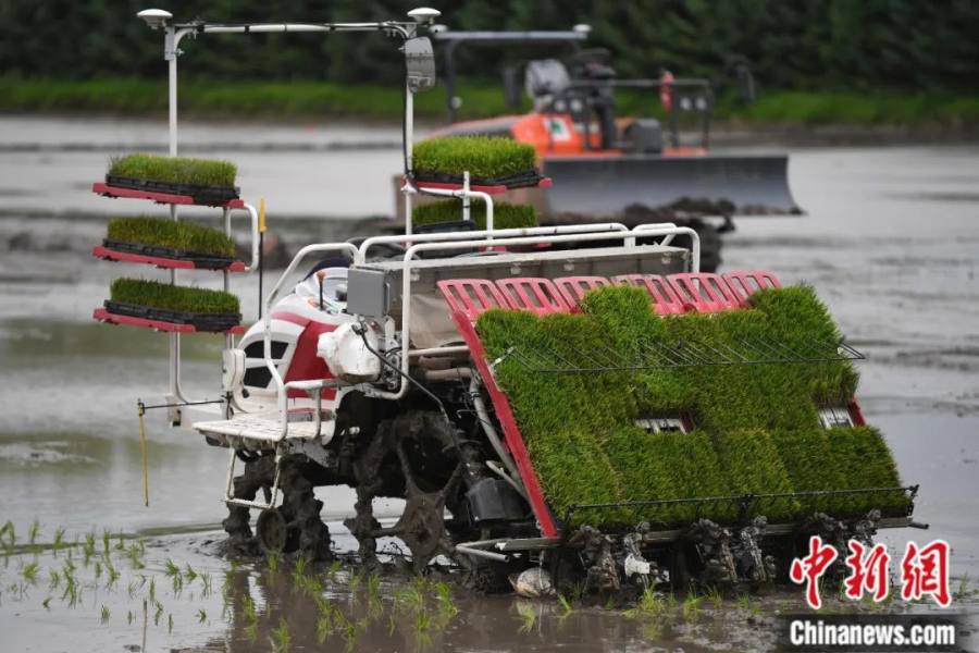 在“中国绿色米都”北大荒农垦集团有限公司建三江分公司,无人驾驶插秧机在稻田里自动插秧。