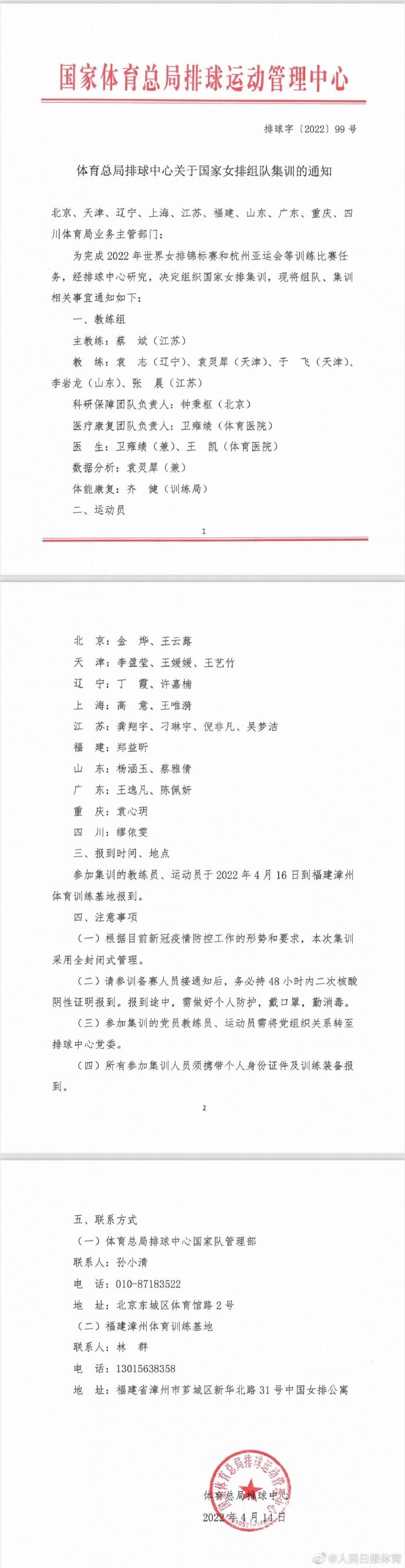 根据通知要求,参加集训的教练员和运动员将于4月16日到福建漳州体育训练基地报到。