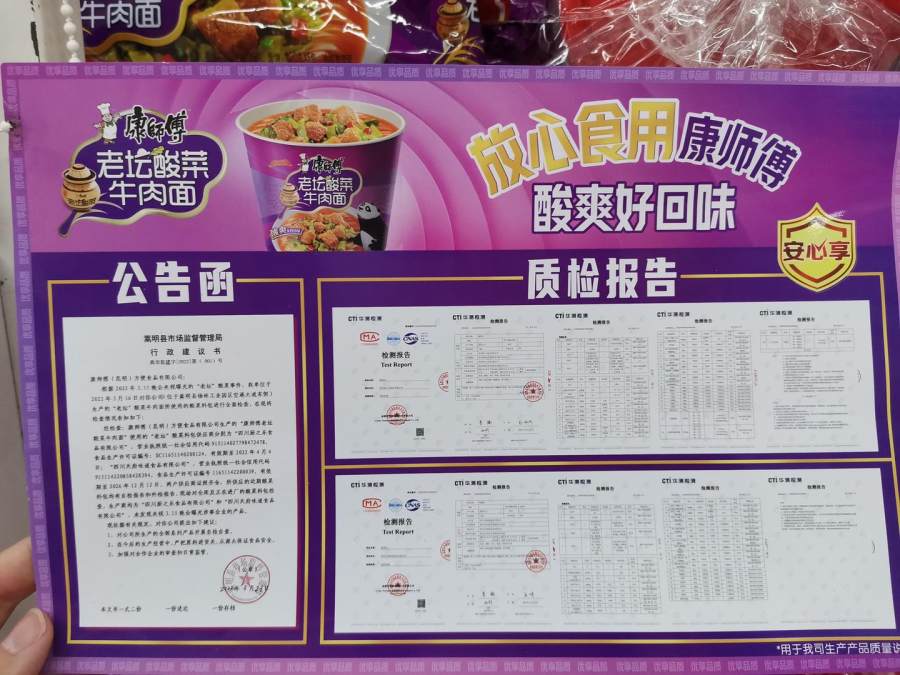 据中国新闻网报道,近日在云南昆明部分超市,老坛酸菜方便面重回货架,一起出现在货架上的,还有嵩明县市场监督管理局发布的《行政建议书》等文件。