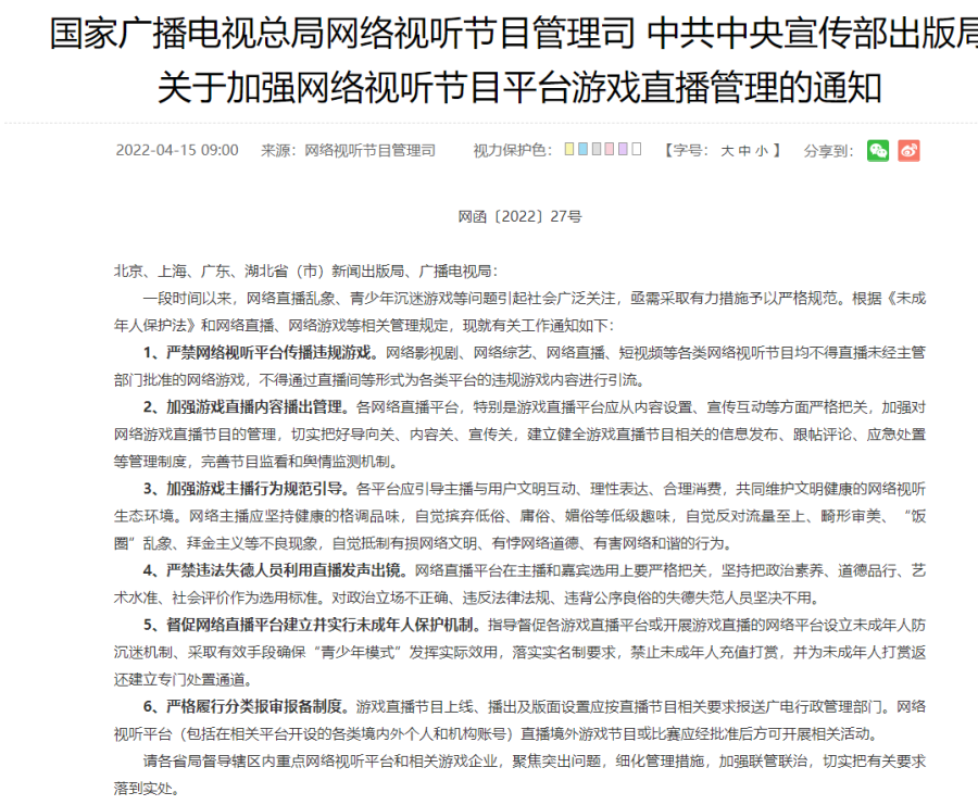 4月15日,国家广播电视总局网络视听节目管理司和中共中央宣传部出版局发布关于加强网络视听节目平台游戏直播管理的通知,以下为全文: